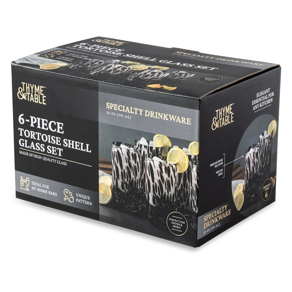 Each glass features a unique tortoise shell pattern in a sk black hue, adding a touch of sophistication to any table setting. Crafted with high-quality, durable glass, these 20oz tumblers are perfect for both everyday use and special occasions. Their generous size makes them i for a variety of beverages, from refreshing iced teas and lemonades to cocktails and mocktails.