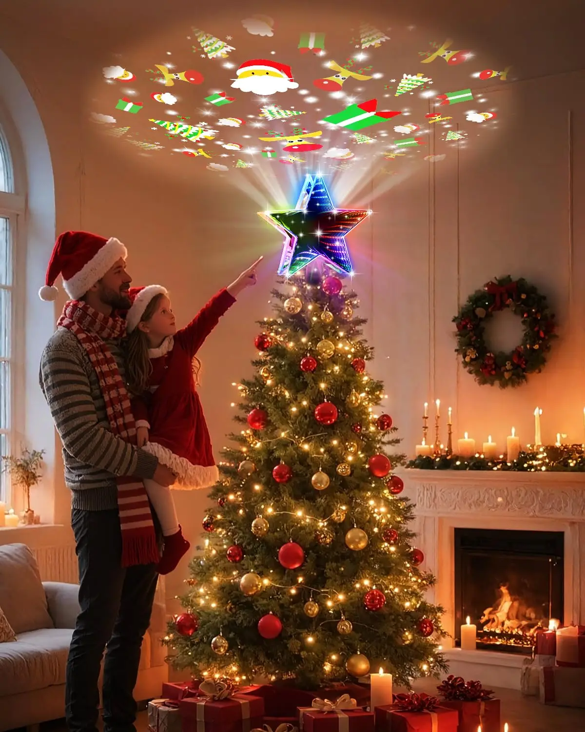 Our Christmas tree topper isn’t just a decor—it’s a 4-in-1 holiday magic maker! It projects vibrant patterns (snowflakes, Santa, reindeer, and more) onto walls or ceilings, plus features 12+ RGB color modes (both static and dynamic). One piece replaces “tree topper + projector + night light + party decor”, making it perfect for Christmas, New Year, birthdays, and other occasions.